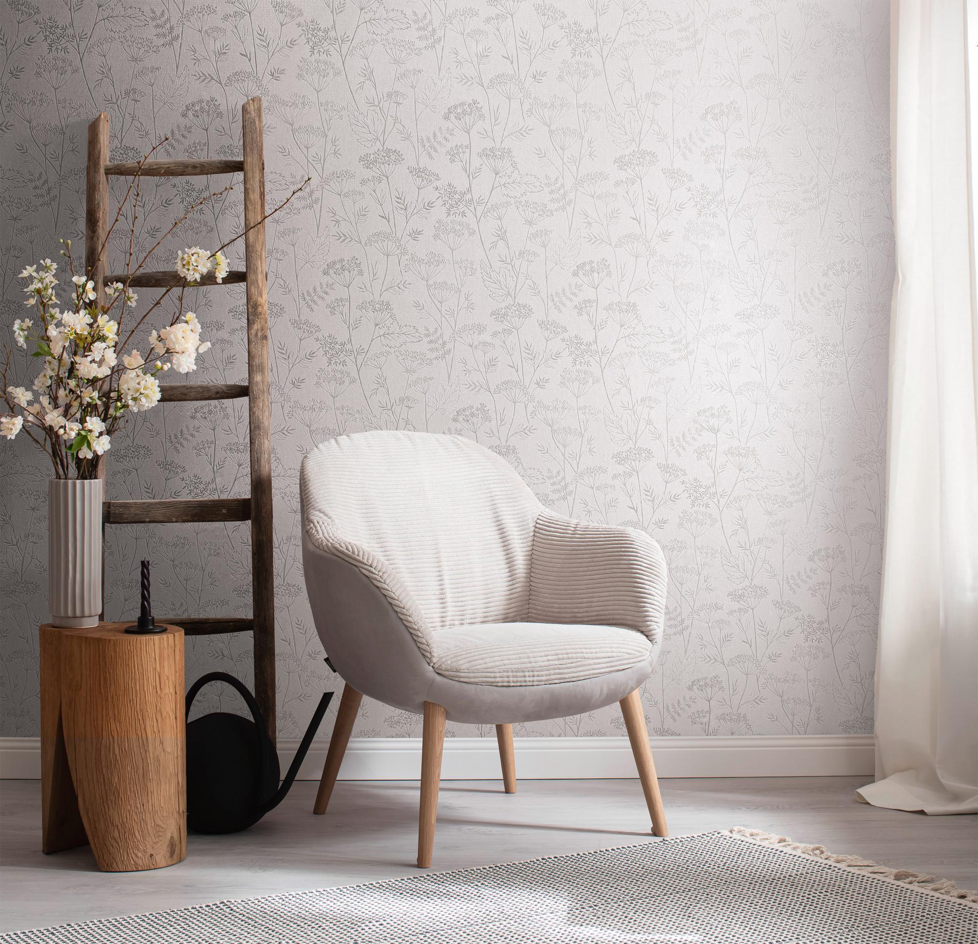 На обои нанесен рисунок мелких веточек и листьев серого цвета.